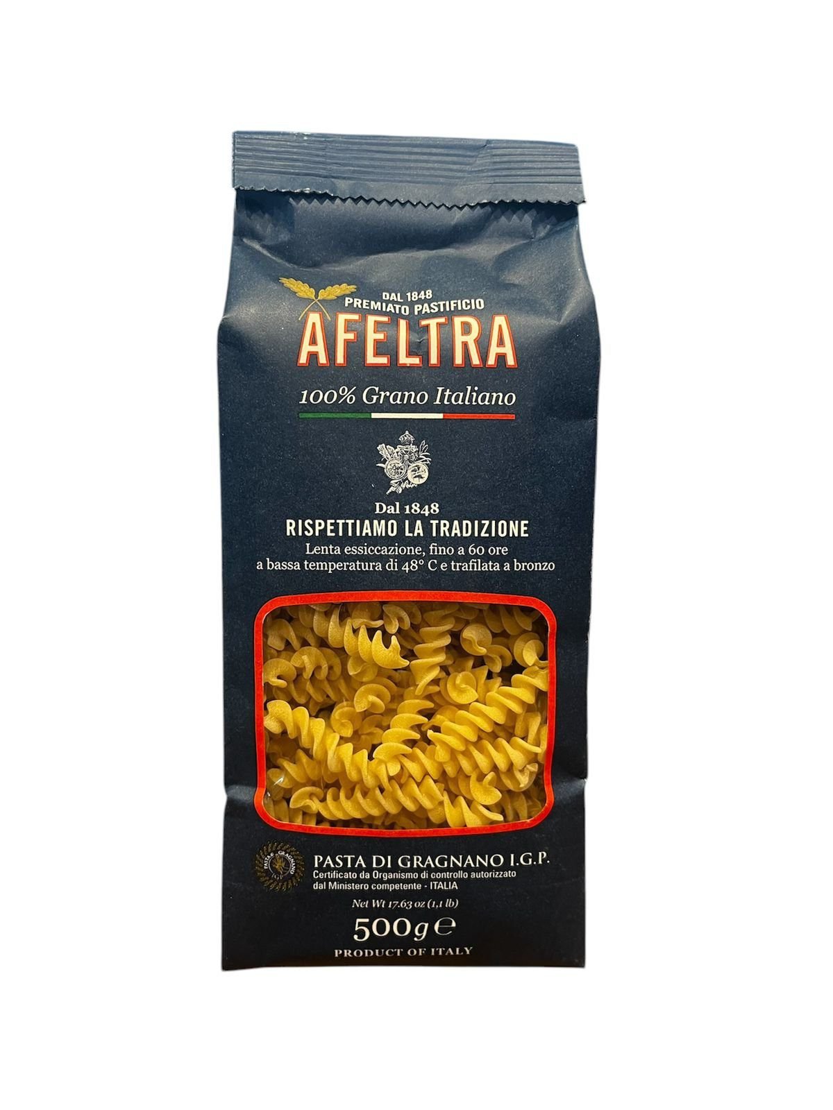 La pasta Afeltra se produce artesanalmente en Gragnano, Italia, siguiendo métodos tradicionales. Se elabora con sémola de trigo duro de alta calidad y agua de manantial. La pasta se trafila en bronce y se seca lentamente a bajas temperaturas.