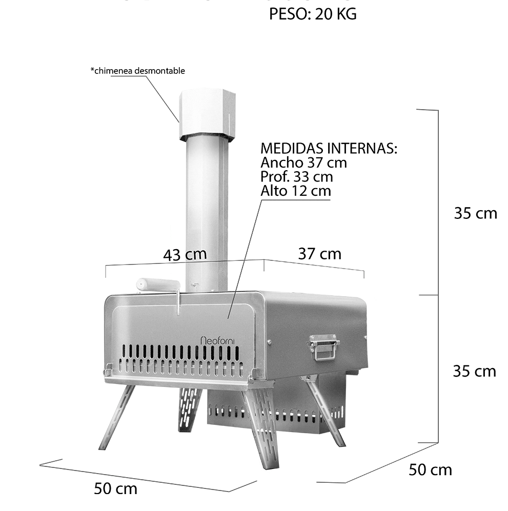 Mini horno a Leña, fabricado totalmente en Acero inoxidable con piezas desmontables y plegables lo hacen fácilmente transportable.Desarrolla altas temperaturas y llega a más de 450 C., ideales para tus Pizzas tipo Napolitanas.Fabricado con materiales 100% inoxidables, es ideal para uso exterior.Super versátil y se puede cocinar pizzas, carnes, pastas, postres etc.Práctico y eficiente ya sea para uso doméstico o bien para locales gastronómicos, foodtrucks y caterings, etc.