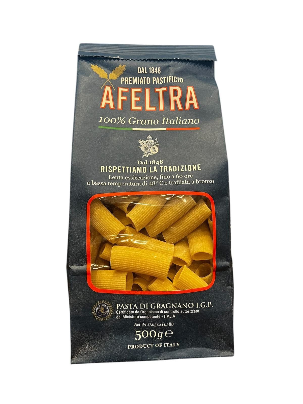 La pasta Afeltra se produce artesanalmente en Gragnano, Italia, siguiendo métodos tradicionales. Se elabora con sémola de trigo duro de alta calidad y agua de manantial. La pasta se trafila en bronce y se seca lentamente a bajas temperaturas.